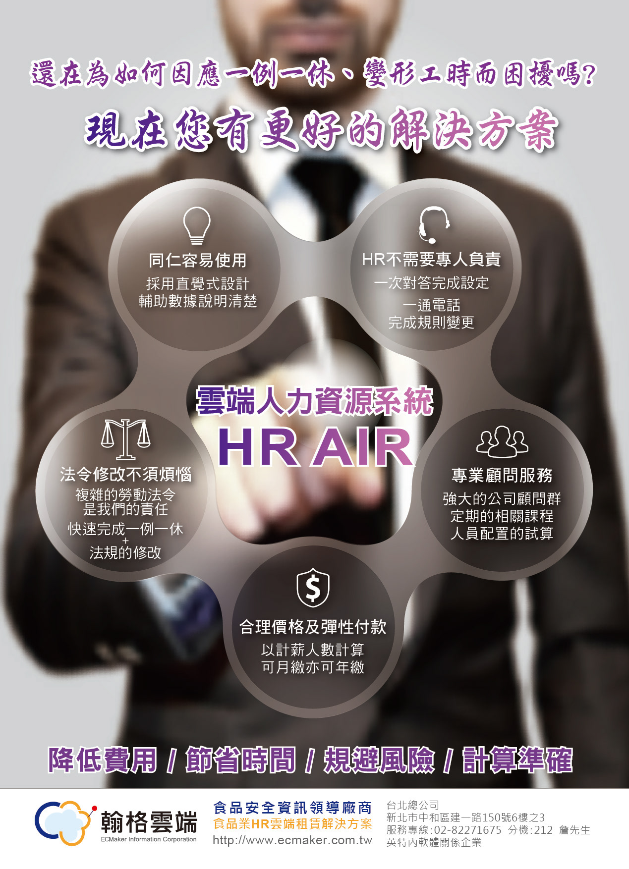 以產品標準色-紫色搭配鮮明色彩,區塊化產品特色介紹,並搭配專業商務人士,凸顯雲端版人資系統,專業、簡潔、易用性。